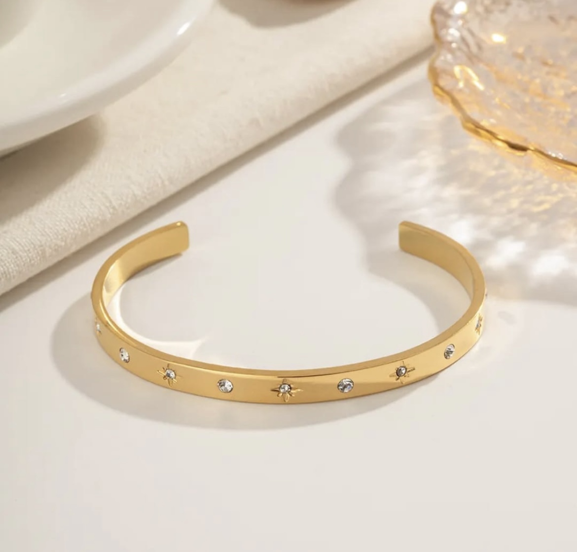 The Tiffany Cuff is a structured gold-plated piece detailed with delicate star accents and circular stud elements. The contrast of clean metal and subtle sparkle gives it personality without losing its refined edge.