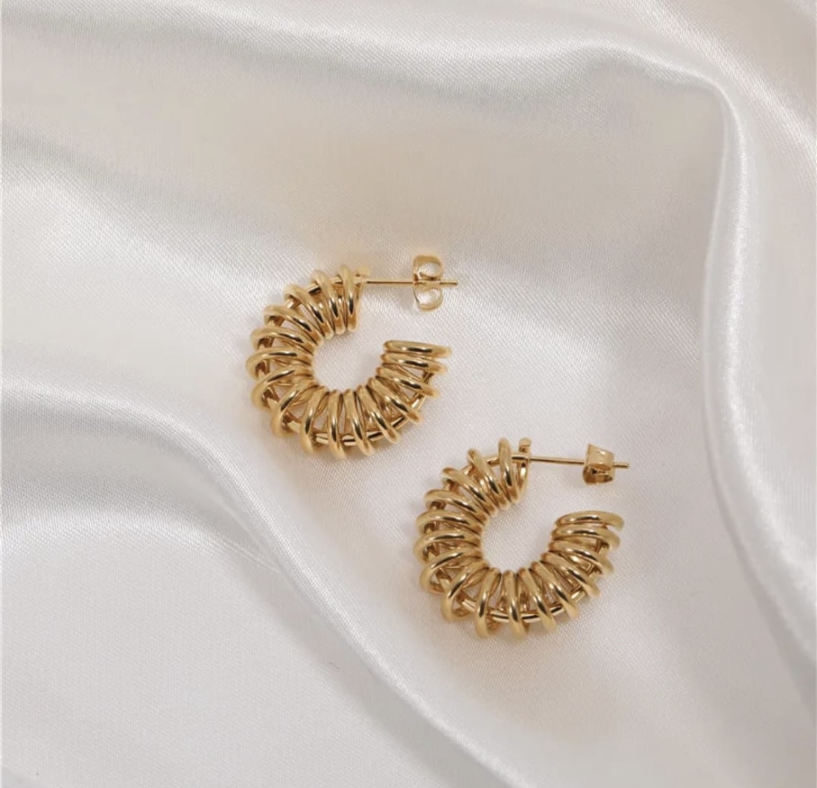 The Spyro Earrings feature classic gold-plated hoops detailed with a spiral design that adds depth and visual interest. The flowing pattern brings a modern twist to a timeless hoop, creating a look that feels both bold and refined.
